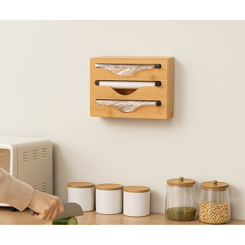 Bamboo Cling Film Dispenser with Slide Cutter 3 in 1 Plastic Wrap and Aluminum Foil