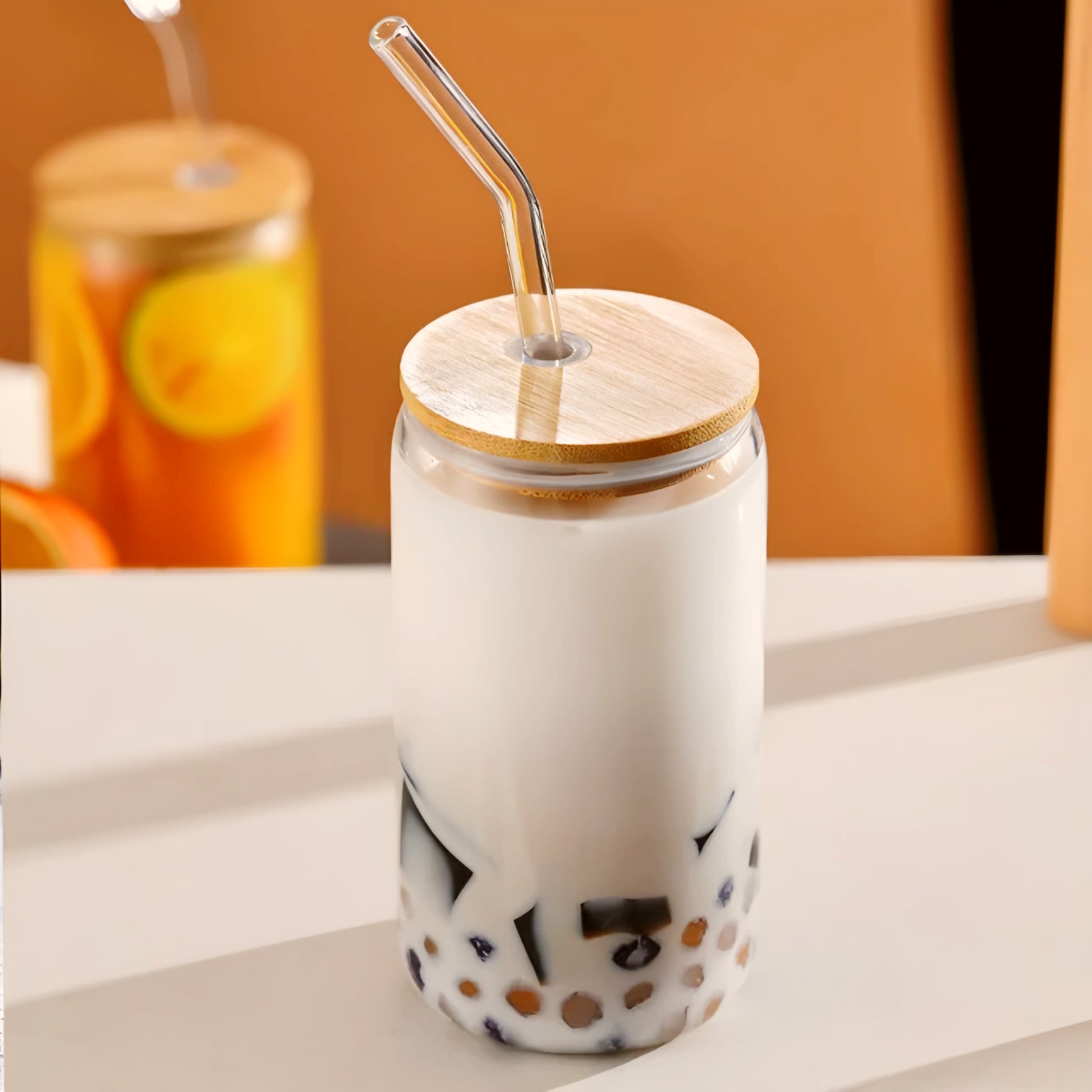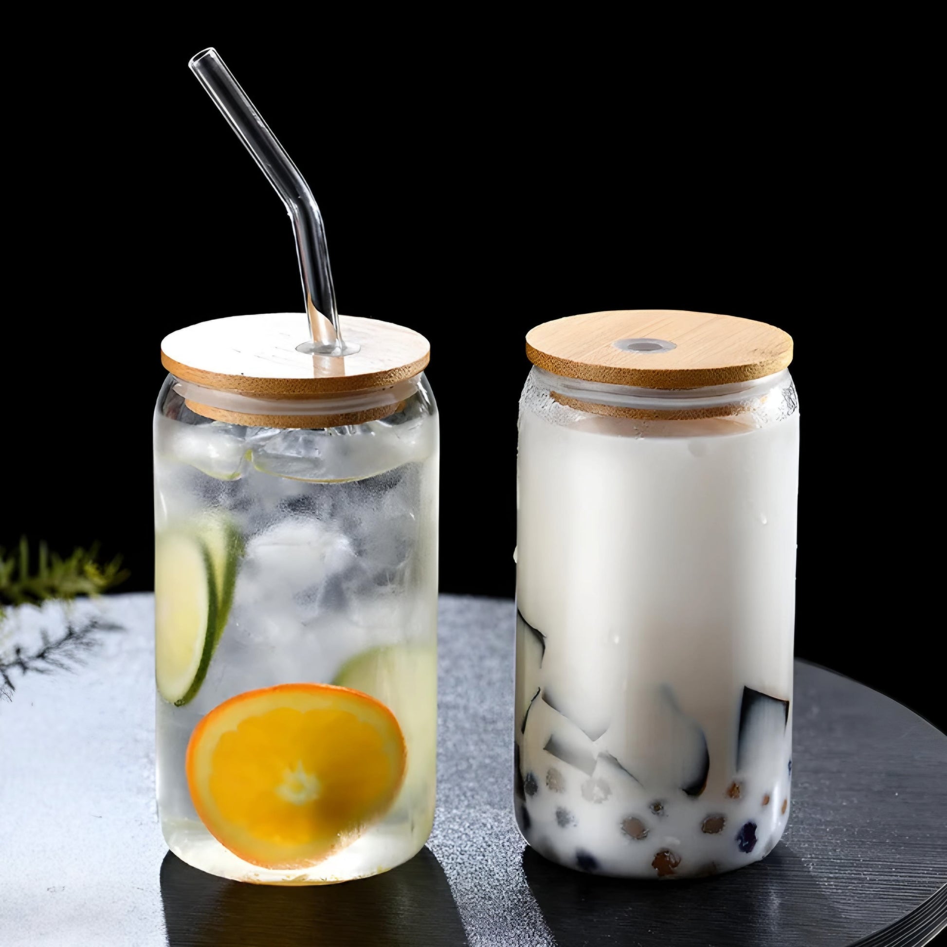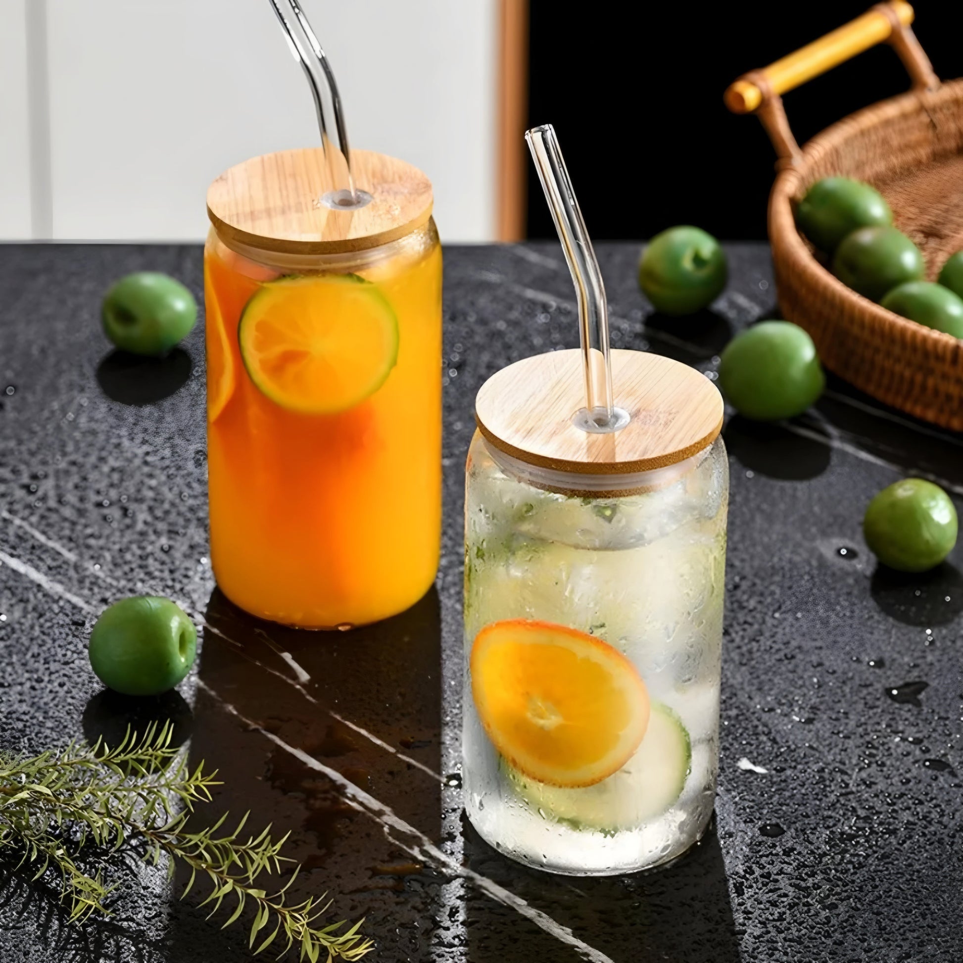 CAN GLASS WITH BAMBOO COVER AND GLASS STRAW