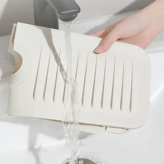 This silicone sink faucet mat measures 45*10 cm and offers a durable, non-slip surface for your sink. It protects both your dishes and your sink from scratches, stains, and damage. Keep your sink looking clean and new with this practical and effective mat.
